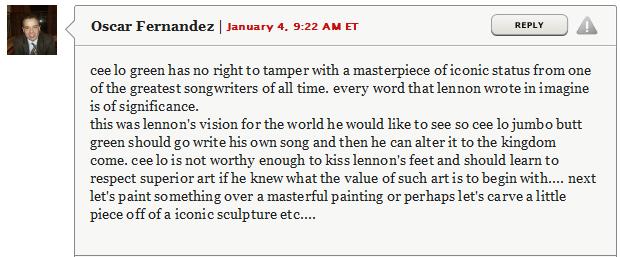 Recently, there was a big kerfuffle over Cee Lo Green, whom I love, changing some key lyrics to a really popular song by John Lennon, whom I don’t love but don’t necessarily hate either. I won’t hash over the gory details, because it’s kind of common knowledge by now, but it made a lot of people really, really upset. I mean really upset. Like this morsel of butthurt: