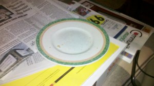For comparison’s sake, and because I didn’t have the foresight (or the time, apparently) to take a picture of the cake beforehand, imagine a piece of cake that takes up about half the surface of that plate, which is actually a teacup saucer. That was a pretty big slice of cake.
