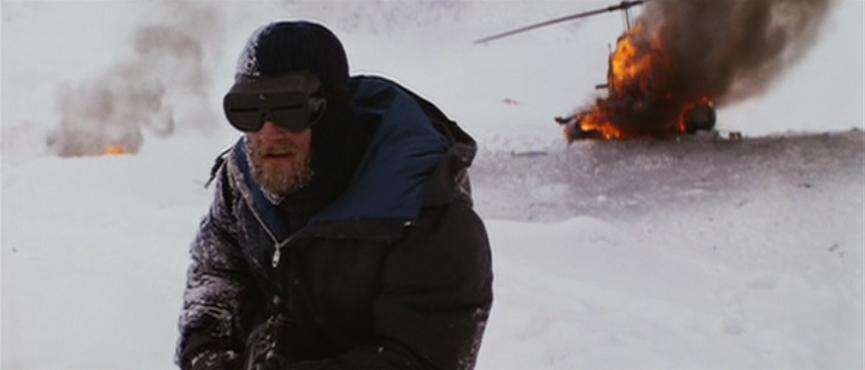 Chasing what appears to be an Alaskan Malamute, two Norwegians descend in their helicopter on a US research base in the Antarctic, guns blazing. One shoots Bennings (Peter Maloney) in the leg, grazing him; the other accidentally drops a thermite charge, destroying the helicopter and blowing himself up. The gunman gives the bewildered Americans a warning in (broken) Norwegian: “Se til helvete og kom dere vekk. Det er ikke en bikkje, det er en slags ting! Det imiterer en bikkje, det er ikke virkelig! Kom dere vekk idioter!” Translated to English, he’s saying, “Get the hell out of here. That’s not a dog, it’s some sort of thing! It’s imitating a dog, it isn’t real! Get away, you idiots!” As he advances on the US camp, he is killed by Garry (Donald Moffat), base commander, and the Americans are left to make sense of what just happened.