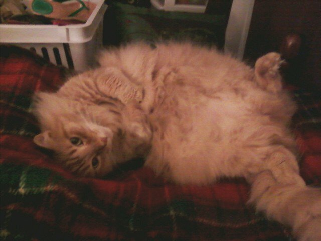 I don’t know if he also suffered some kind of vocal cord damage from the flea collar that was on too tight, but Sherbert doesn’t really have a normal cat meow. He chatters a lot. He also makes a sound that can only be described as “marf.” It’s almost like a soft barking sound. He is exceedingly friendly with other cats, and gets confused when other cats don’t like him. There is currently an outdoor kitty — Lil’ Punkin’ — who is his ladyfriend. They sit with each other at the back patio, a screen door separating them. He is afraid of storms and small children. He loves yogurt and turkey cold cuts from Subway (just Subway, not any other turkey cold cuts, inexplicably). He is incredibly mild-mannered and non-confrontational. He doesn’t get in your face or steal your food, although if you leave a blankie lying around he’ll claim it within seconds. He has gotten very used to being a housecat.
