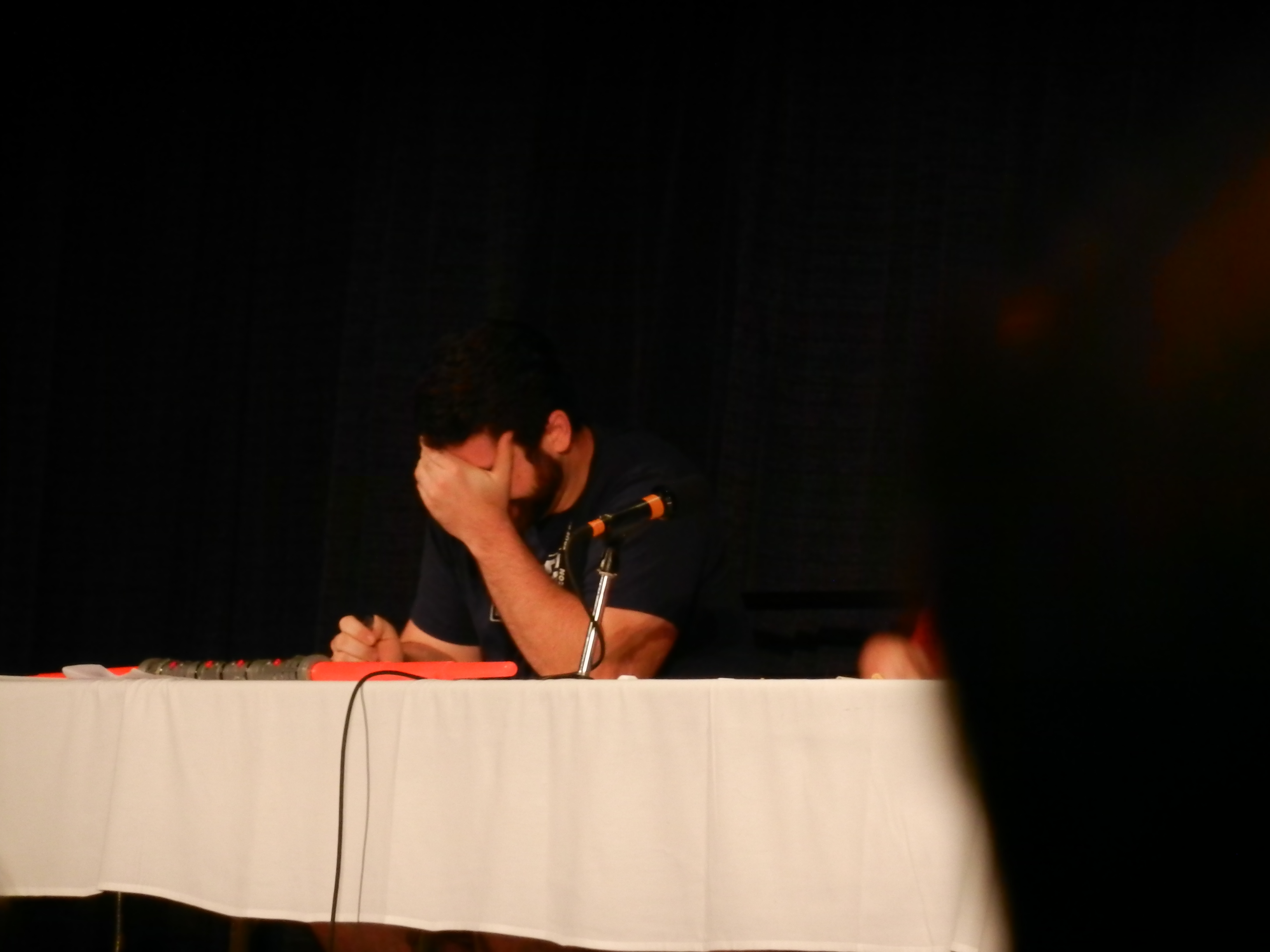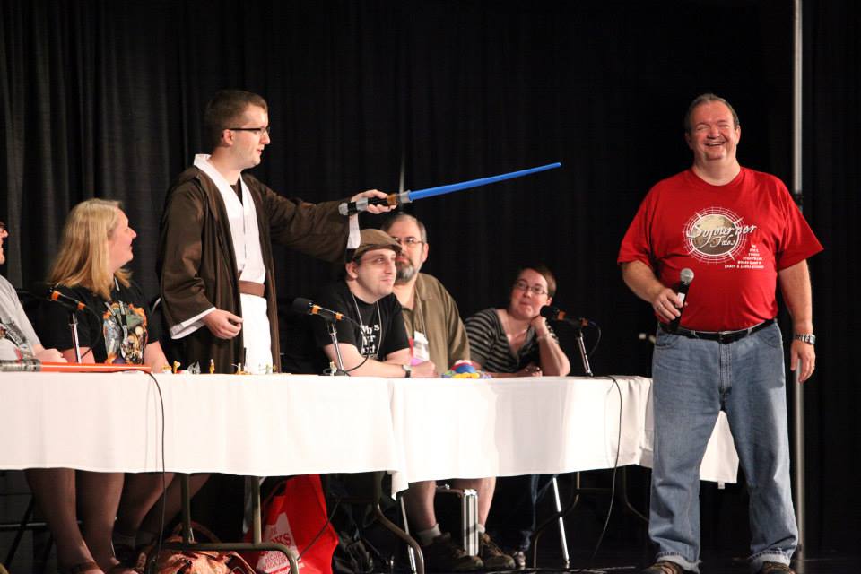 The third day at Gen Con was the longest, and had the most exciting bits in it. We got an early start on the day, because Tank, Matt and I signed up for Tracy Hickman‘s Killer Breakfast. Now, I’m pretty much a n00b when it comes to the games community, and the fantasy community, of which there is a lot of overlap in fans. I didn’t know it, but Hickman is kind of a rock star at Gen Con, and his Killer Breakfasts draw a large crowd. The premise of Killer Breakfast is that you can opt to participate in an on-stage role-playing game in which you will most definitely be killed by Hickman, who acts as game master. His goal is to kill you as fast as he can, in often creative and humorous ways. I was pretty nervous about being up on a stage in front of what ended up being a packed house, and then on top of that having to come up with ways to NOT get killed within moments of joining the game, and yet, there I was: