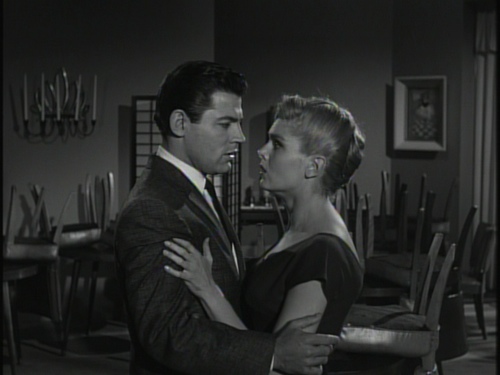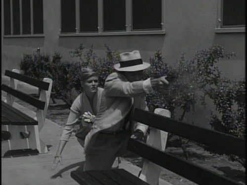 For being a film with a running time of just 70 minutes, Cage of Evil never feels too short, although some early scenes actually seem to go on much longer than they need to. Once Scott and Holly have a deadly run-in with her gangster boyfriend and Scott’s partner on the force, the film really picks up the pace, and there are several moments of genuine tension as the noose tightens around them both. One scene in particular, where our two leads avoid getting caught in a stakeout situation, shows them driving away after Scott lies to fellow police officers under the premise of taking Holly back to the airport to accompany her home. As they drive away, a car seems to be tailing them while they obliviously prattle on about their plans to take the diamonds to Mexico. The car gets right up to their back bumper at a stop, but no siren goes on and no one gets out. This was likely unintentional on the filmmakers’ part, given that it’s rear-projected footage and likely stock footage at that, but it certainly stopped my heart for a moment.